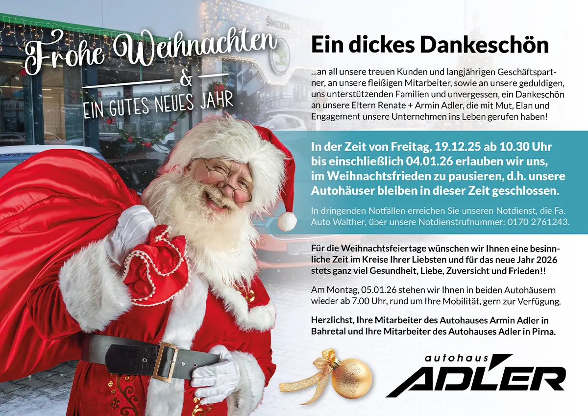 In der Zeit von Freitag, 19.12.25 ab 10.30 Uhr bis einschließlich 04.01.26 erlauben wir uns, im Weihnachtsfrieden zu pausieren, d.h. unsere Autohäuser bleiben in dieser Zeit geschlossen.