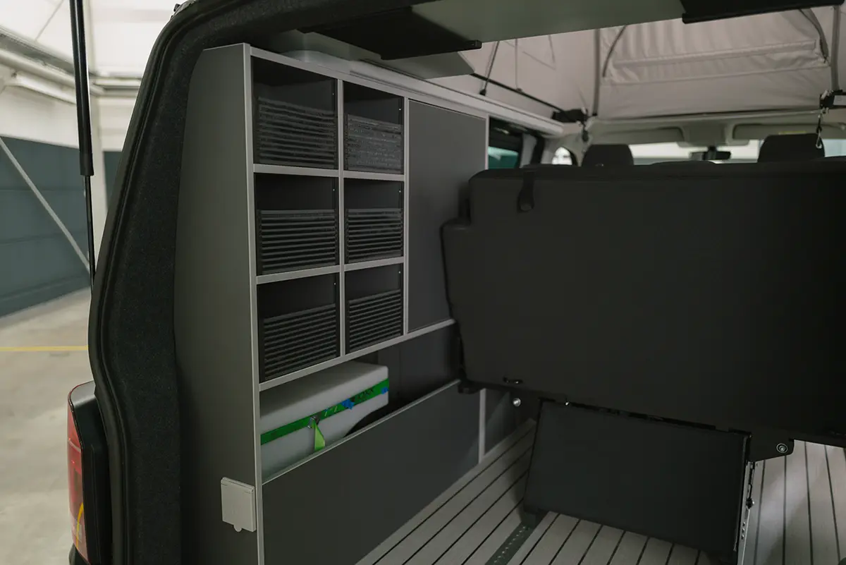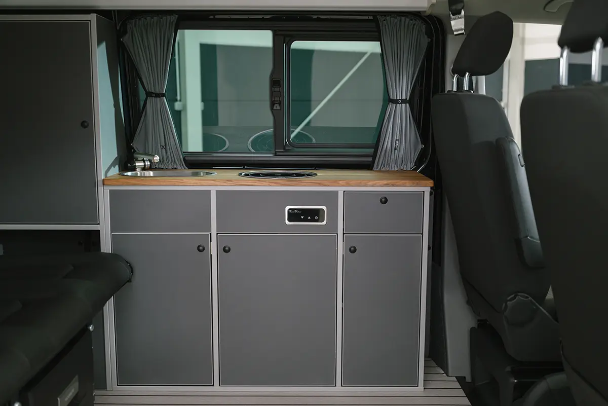 Die komplette Möbelzeile zeichnet sich durch ihr zeitloses Design aus. Und dank der vielfältigen Auswahl an Dekoren, Premium-Sitzbezügen und zahlreichem passenden Zubehör wird der Volkswagen T6.1 Camper sicherlich auch Ihrem persönlichen Geschmack gerecht.