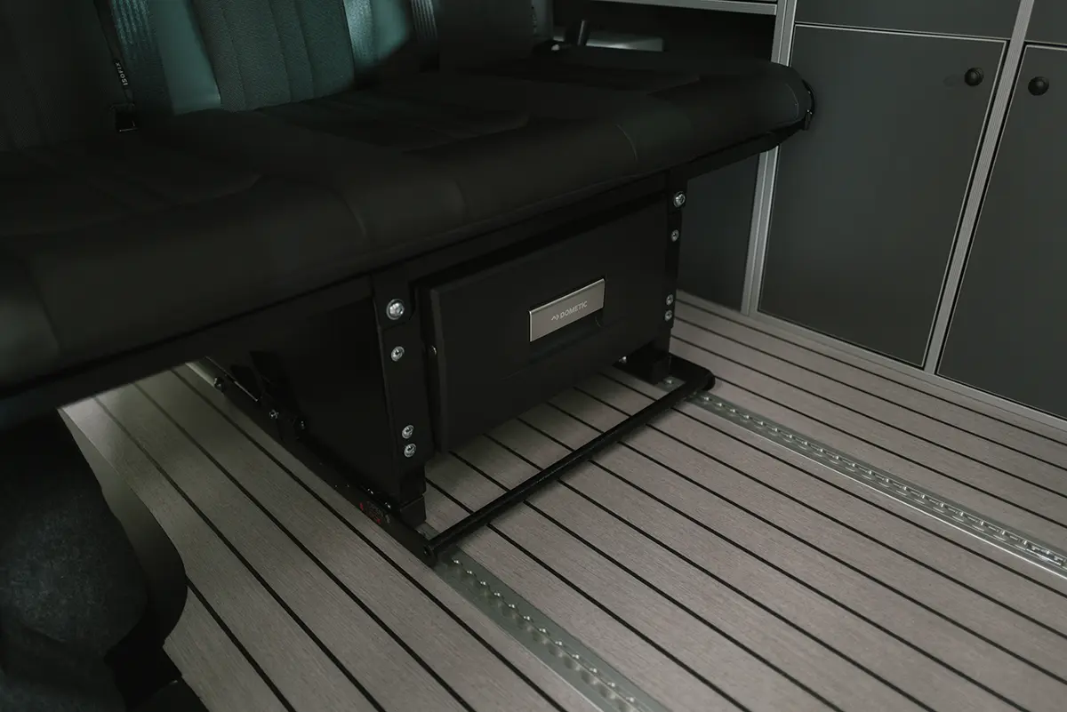 Die Sitz- und Schlafbank bietet absoluten Komfort auf Reisen. Sie lässt sich flexibel auf dem Schienensystem bewegen. Der Platz im Fahrzeug ist so optimal nutzbar. Außerdem verfügt sie über Isofix und Dreipunktgurte – für die Sicherheit von bis zu drei Personen.