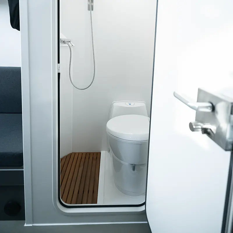 Die Einrichtung wird durch das Badezimmer, dass sich in der Mitte der travelboxx mit Dusche und Kassettentoilette befindet, absolut perfekt.