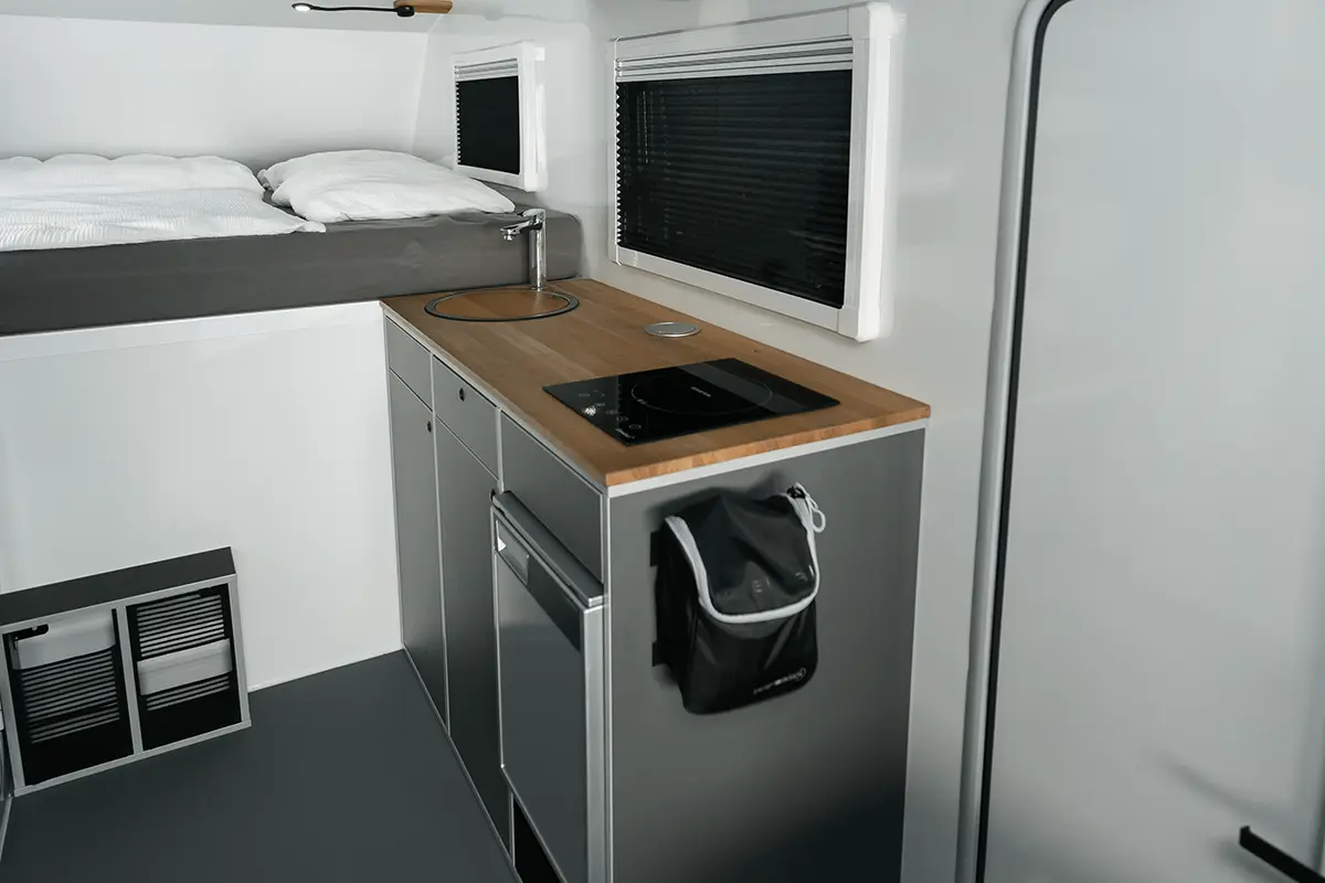 Die Möbel in der Wohnkabine von vanexxt sind praktisch und funktional gestaltet und bieten ausreichend Stauraum durch Sitztruhen, Packtaschen und zwei Oberschränke.